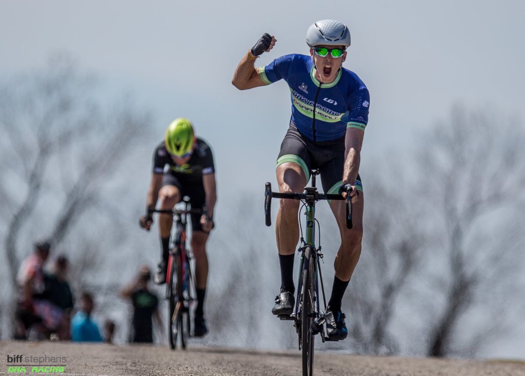 The early breakaway formed over the rolling hills, as Purvis and Ryan Dupree (Soundpony) went clear of the field. They never got much of a lead, as the Throwback Racing team kept the gap manageable. On the climb at the end of the first lap Housler pushed the pace and a selection formed. I had been out of position coming into the climb and had to work hard in order to be the last man to get across the gap. Bybee, Cesar Serna (OBP), and Jordan Miller (Olathe Subaru) had also made the break. Kevin Solomon was there as well, but unfortunately flatted almost as soon as the break had formed. We quickly caught the two leaders and then worked throughout the second lap to stay ahead of the peloton. Some attacks cam early in third lap, but nothing was able to stick. Once we turned north with about 10 miles to go, we were well out of sight from the main field. The group had dwindled down to just Purvis, Housler, Bybee, Serna, and me. Attack after attack went, and every one of them felt like it might be the last one that I would be able to respond to. Eventually, Purvis was the first one to be dropped, then, with about 4 miles to go, Bybee put in an attack that temporarily distanced Housler, but he was able to rejoin Bybee, Serna, and me with just under 3 miles to go. With 2 miles to go, the pace had slowed as we sized each other up in anticipation of the finish. I didn’t like my chances in a sprint (even uphill) against this group, so I attacked hoping to go solo to the line. I was able to open up a decent gap and made the turn onto the final climb with a 7-second advantage over Housler and Serna. I was hoping this was a big enough gap, but when I saw Cesar Serna shooting up the hill behind me, I knew it would be tough to hold him off. I kept waiting for the finish line to appear around the gradual left-hand bend in the road, but once it did he was already on my wheel. For a second I thought he had run out of gas and I might still have a chance, but with a few more powerful pedal strokes he pushed past me for the win as I settled for my second runner-up placing of the weekend, and one step down on the podium from last year.
