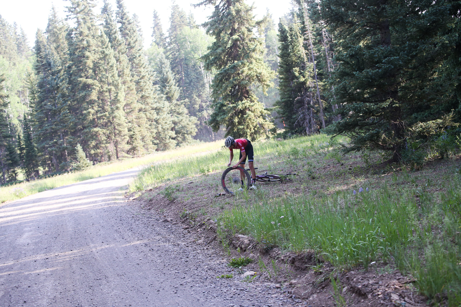 The race started peacefully as the first 10 miles are up a slight incline on a paved highway. With temperatures in the mid 60s for the 7 a.m. start, I was pretty chilly at first, but that wouldn’t last long with high temperatures in valley forecast to be over 100 degrees. At mile 10 we turned off the highway, hit the gravel, and started climbing. I wanted to stay with the front group, but they hit this section harder than I was willing to go this early in the race. I wanted to race conservatively early on to save my energy for the brutal Col du Crush climb in the second half of the course. I made it to the top of the first climb in around 25th place, and after an hour and 45 minutes of riding uphill we finally got to coast downhill. This first downhill is where disaster struck for me, as I managed to find one of the very few sharp rocks on the course and got a puncture. I had a big cut in the sidewall and sealant was not going to hold it. Eventually I was able to get a tube in and get back on my way, but over 100 riders had passed me while I was fixing my flat. A few minutes later I made my next mistake as I blew right past the aid station before the long switchback descent to the valley on the other side of the course. I had plenty of water so I figured I would stop at the next one.