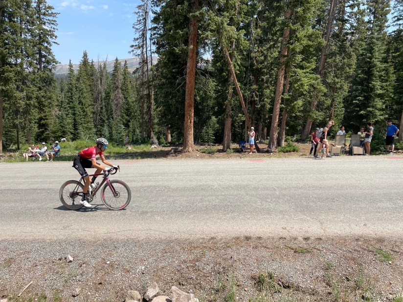 The descent of the Col du Crush was all about survival. The loose gravel made the switchbacks treacherous, and the washboarded gravel certainly didn’t help with control of the bike. Fortunately, it looked like most of the riders were taking the descent carefully, as a few seconds gained on this downhill weren’t going to make a difference with two hours of climbing still to come. The last 5 miles of the descent were on pavement, and this is where the smooth center strip of the Pathfinder tires really came in handy. I was able to get into the super tuck and catch up to several riders to form a nice little group as we reached the valley and the aid station. This is where I realized my mistake as I stopped to fill up my bottles and the other riders carried on. The next 9 miles were on a flat highway, the only part of the course where you really needed to be in a group to get the benefit of the draft. I filled my bottles as quickly as possible and sprinted to rejoin the group.